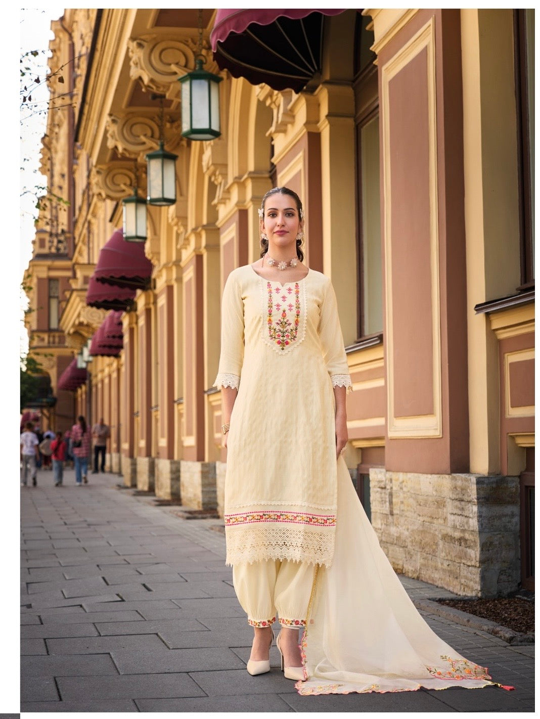 This elegant 3-piece ethnic suit set is crafted to bring festive charm with timeless appeal. The top is made from rich self-jacquard silk, detailed with fine embroidery and handwork, and paired with a soft cotton inner lining for comfort. The Afghani-style bottom is enhanced with embroidered lace and features a functional pocket for convenience. Completing the ensemble is a lightweight organza dupatta adorned with lace and tassels, adding sophistication to the outfit. Designed in larger sizes, this set is ideal for festive gatherings, cultural functions, and evening celebrations, offering both comfort and style for women who value traditional aesthetics with contemporary touches.
