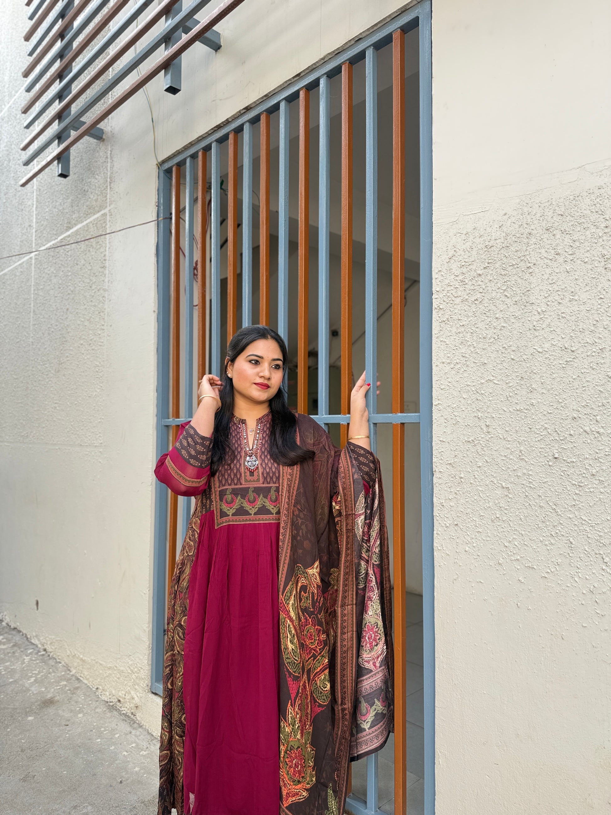The set includes a coordinated bottom that complements the kurta’s colour tone, providing a clean and structured silhouette. A matching printed dupatta completes the ensemble, designed in soft fabric with traditional motifs that add movement and layering to the outfit. The dupatta can be styled in multiple ways depending on the occasion and personal preference.