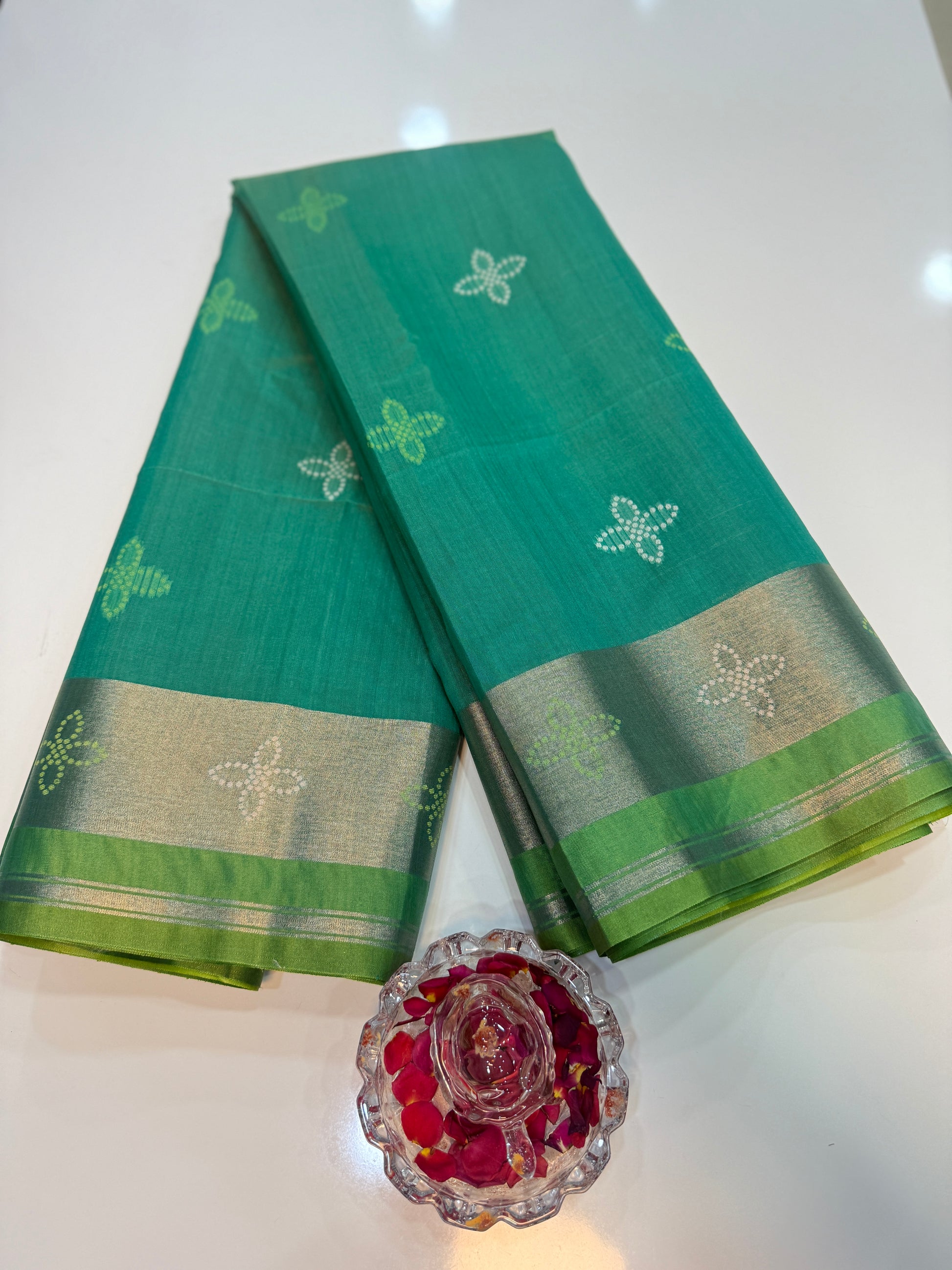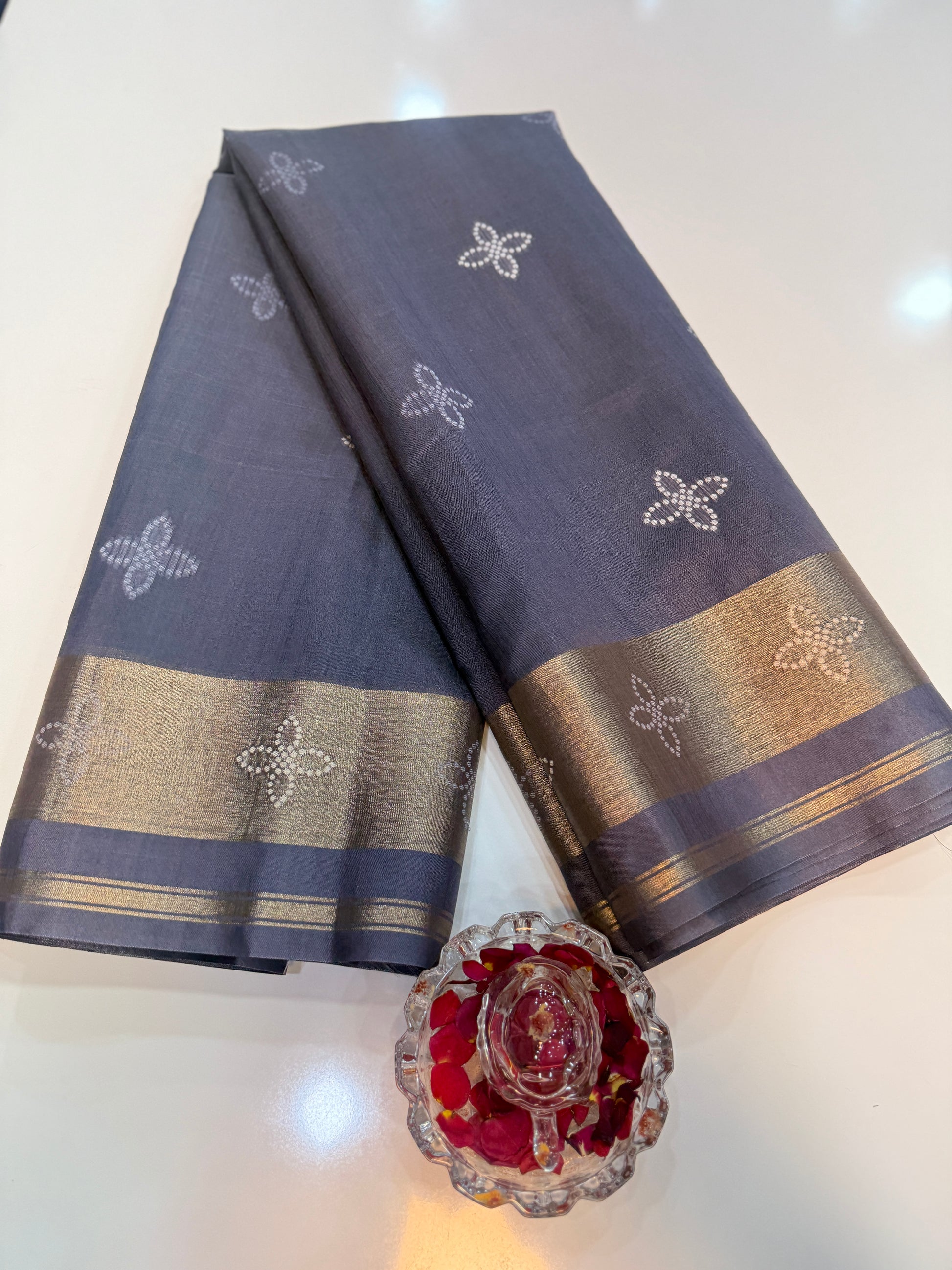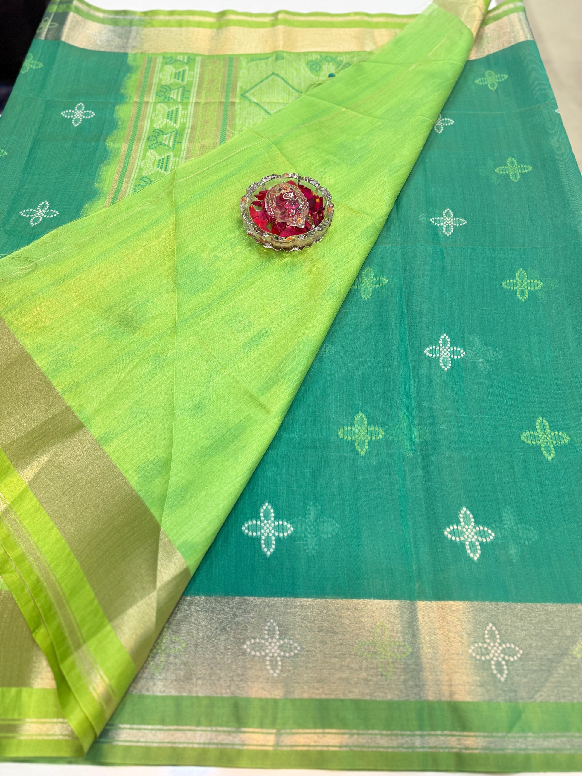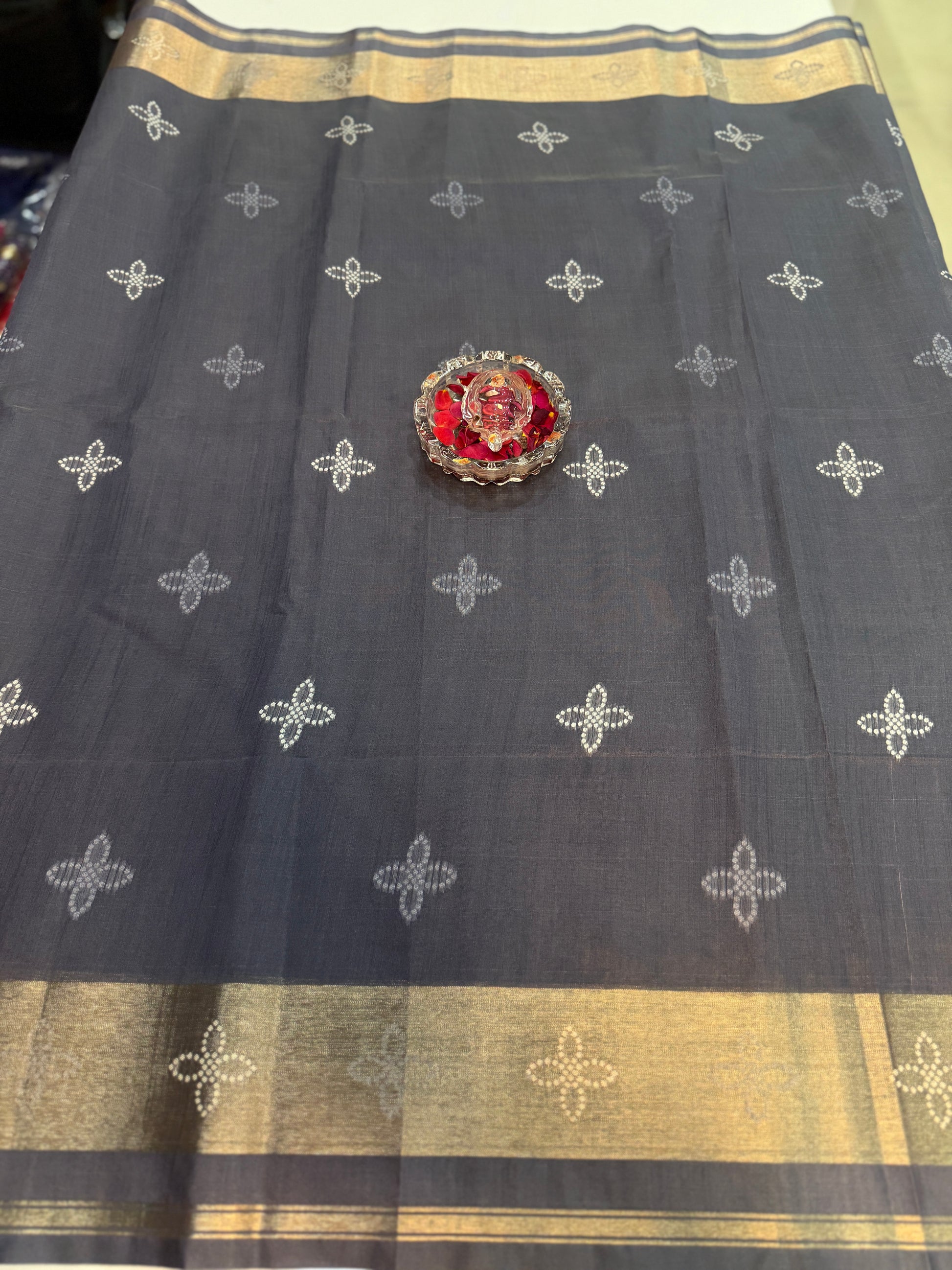 Design details: all-over buti-style motifs with contrast border and pallu pattern