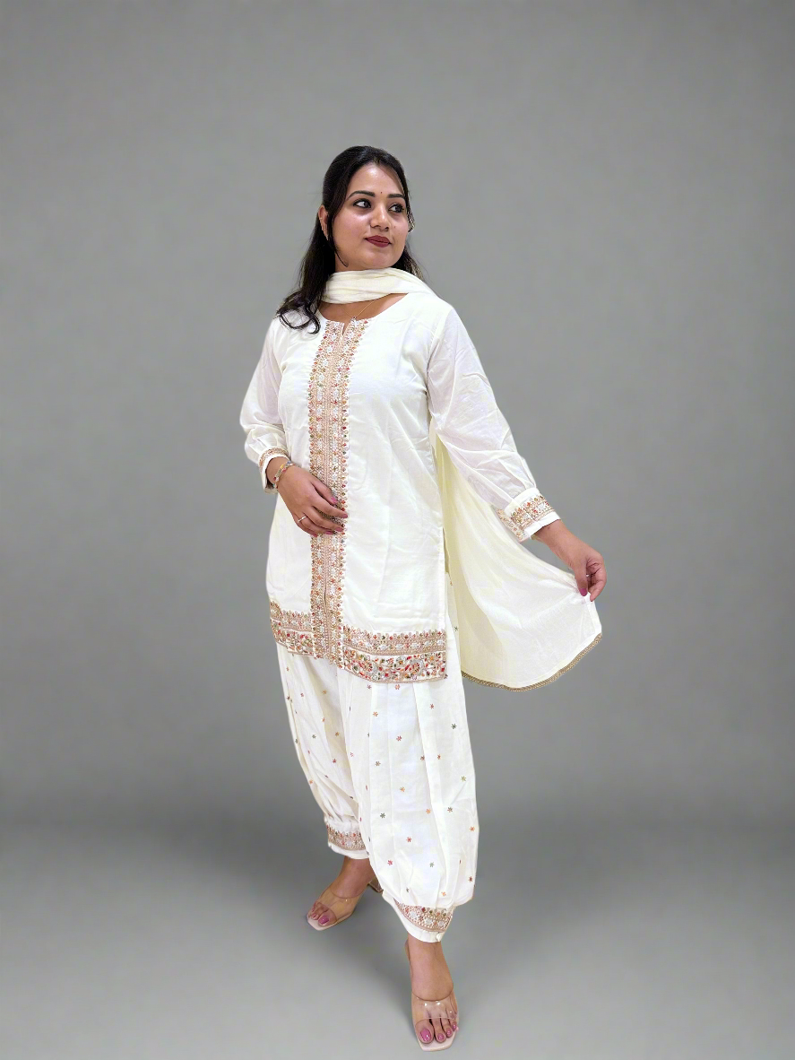 This elegant 3-piece ethnic outfit is crafted from premium vichitra silk, offering a luxurious feel and smooth finish ideal for festive occasions and traditional events. The set includes a stitched top and bottom in sizes L and XL, paired with a complementing dupatta featuring subtle embroidered detailing. Designed for graceful draping and effortless styling, this ethnic ensemble is perfect for festive celebrations, weddings, and family gatherings.